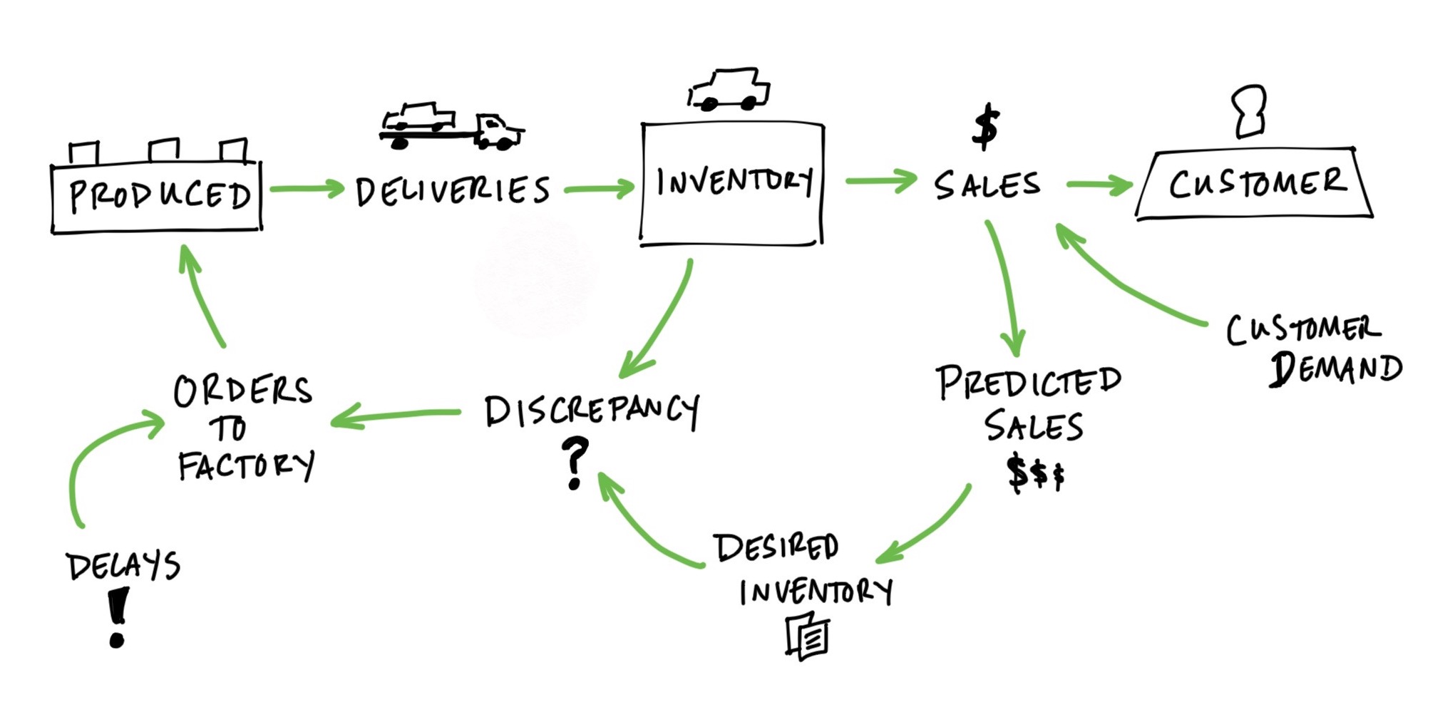 When a car dealer notices an upswing in order flow, they order more cars from the maker. But because it takes time for those deliveries to be made, in the meantime order flow may have slowed down in subsequent months, leaving the dealer with an inflated inventory. The dealer may then halt new deliveries from the maker, but then deplete too much stock. Delays in multiple feedback loops cause rubber-banding oscillations in the stock volume and flow rates.