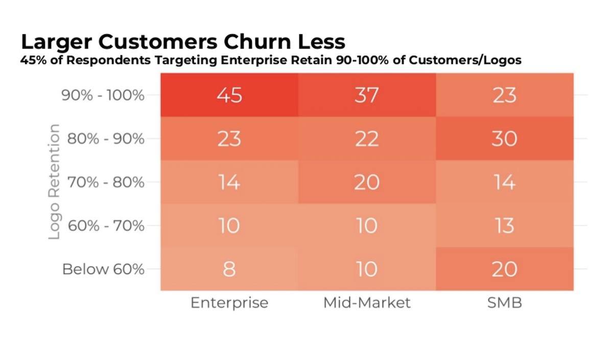I also sat in on a session with Tom Tunguz, VC from RedPoint Ventures, who presented on a survey they had conducted with almost 600 different business SaaS companies across a diverse base of categories. The data demonstrated a number of interesting points, particularly on the topic of retention. Two of the categories touched on were logo retention and net dollar retention (NDR). More than a third of the companies surveyed retain 90+% of their logos year over year. My favorite piece of data showed that larger customers churn less — the higher products go up market, the better the retention gets. This might sound counterintuitive on the surface, but as Tunguz pointed out in his talk, it makes sense when you think about the buying process in large vs. small organizations. Larger customers are more likely to have more rigid, careful buying processes (as anyone doing enterprise sales is well aware) than small ones, which are more likely to buy things “on the fly” and also invest less time and energy in their vendors’ products. The investment poured in by an enterprise customer makes them averse to switching products once on board1: